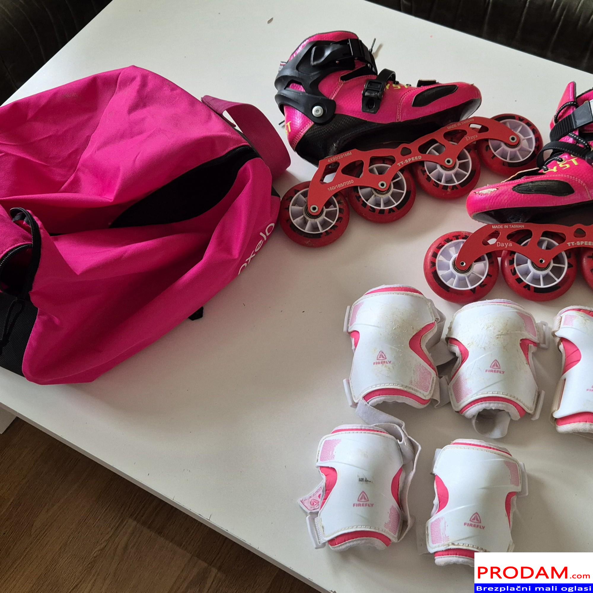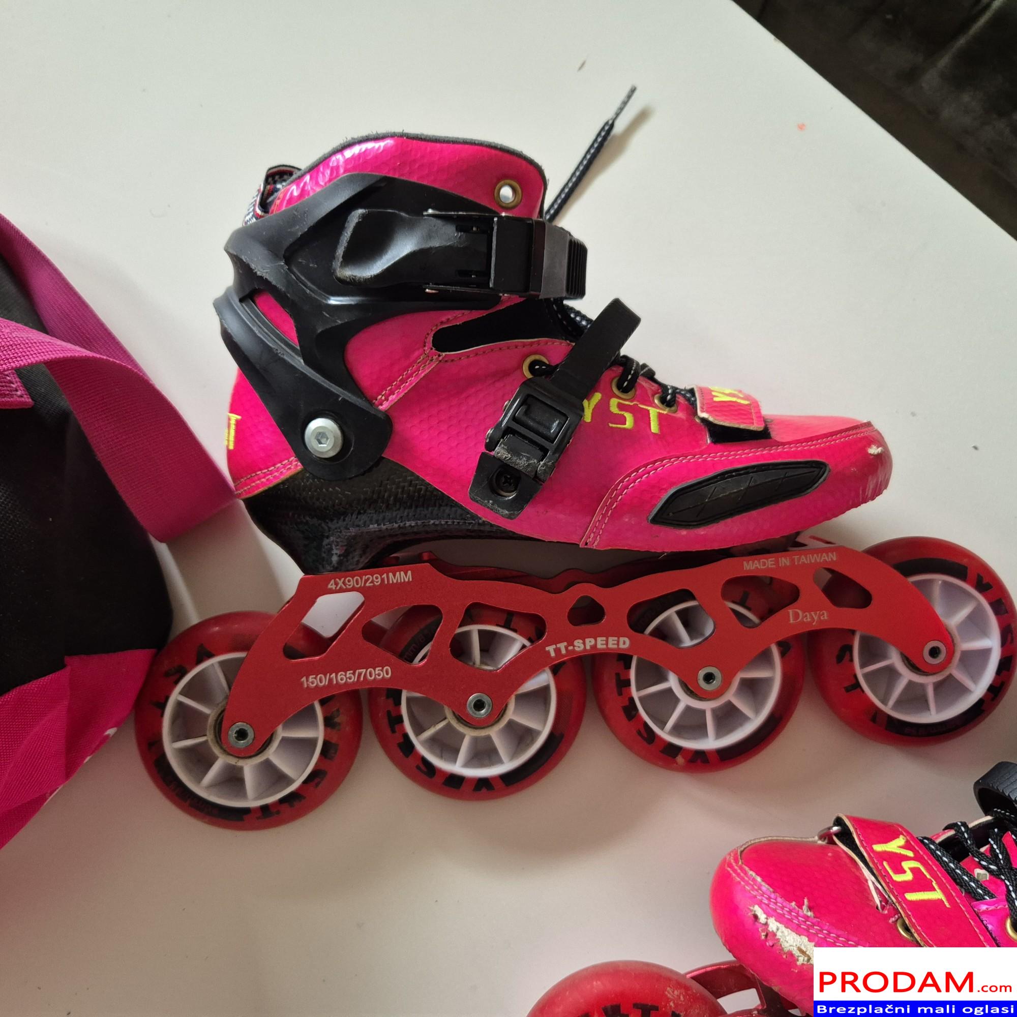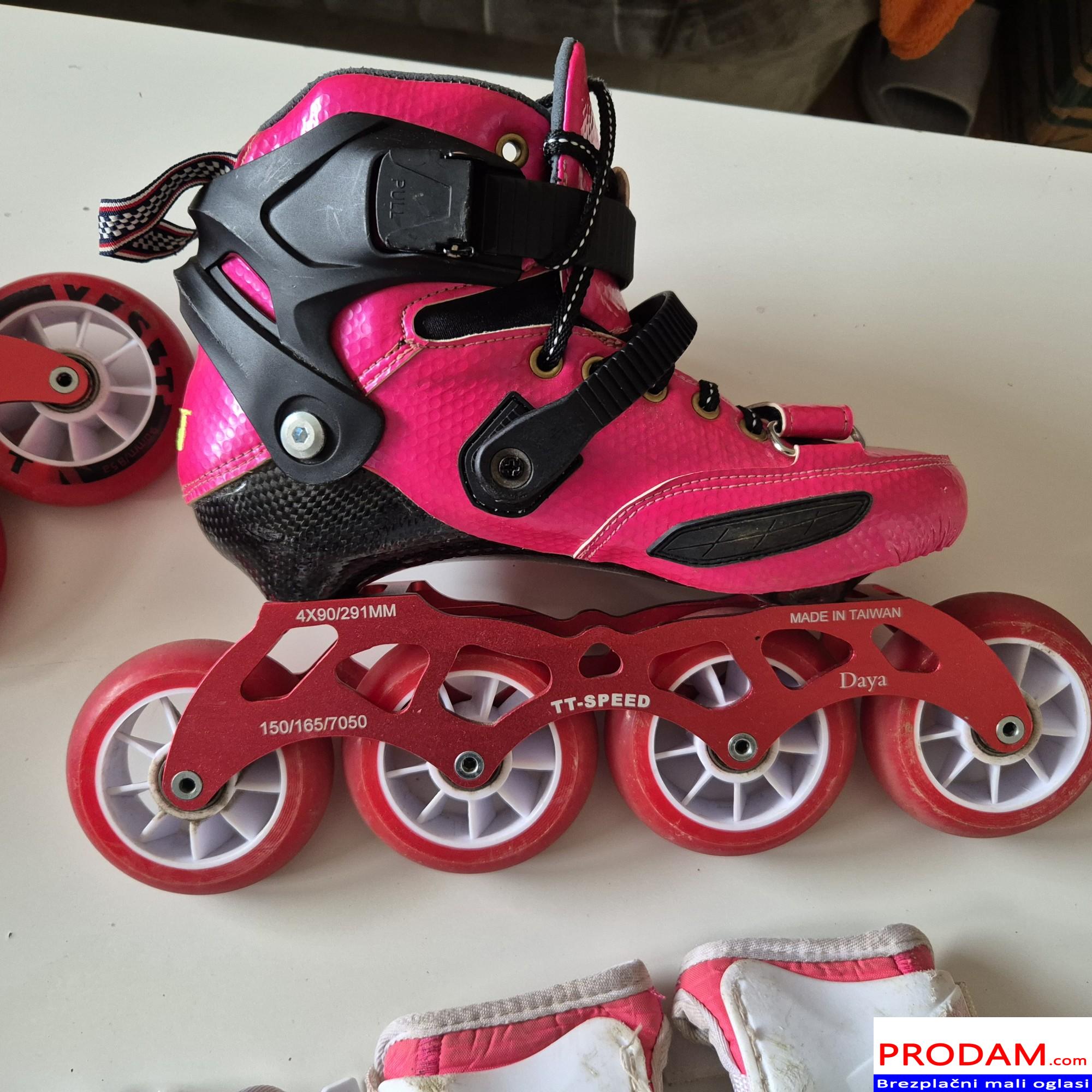 Prodam dobro ohranjene hitrostne rolerje. So zelo trpežni iz karbonskih vlaken. Na vrhu čevlje je edino par prask. Notranja mera čevlja je 24cm, kar bi odgovarjalo 36-38 velikosti. Rolerji so stali 190€ skupaj z poštnino. Zraven je torba Oxelo (10€) in ščitniki (25€) iz Decathlona.