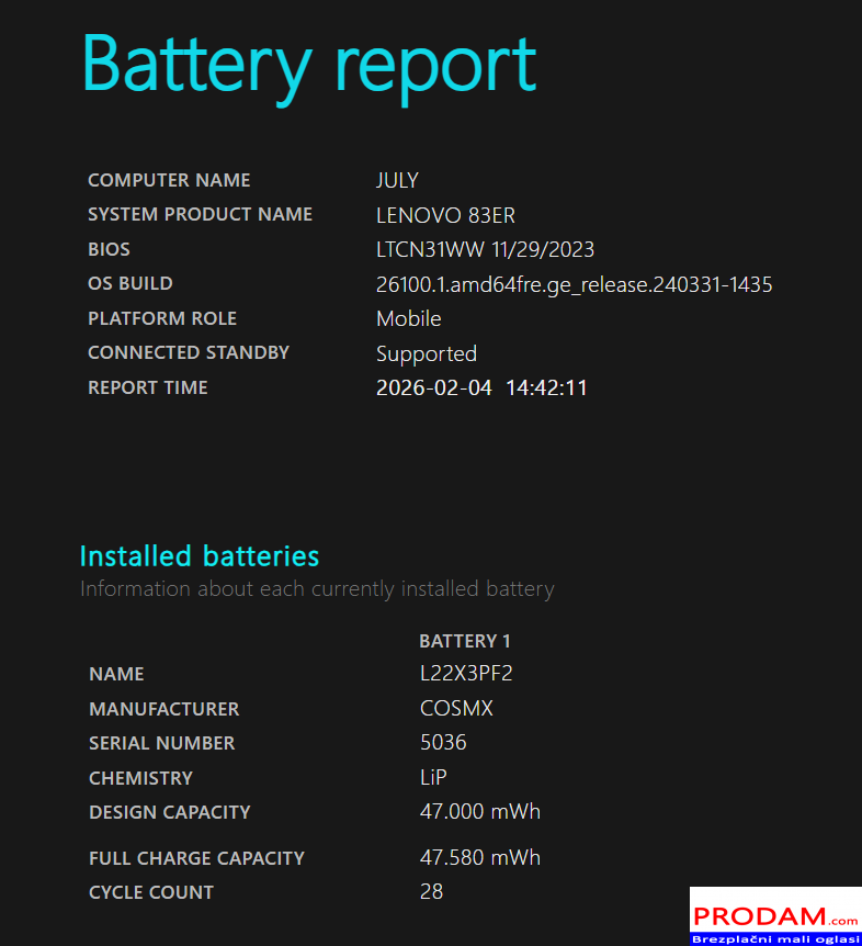 Baterija je v 100 % zdravju, ima samo 28 ciklov, kar potrjuje, da prenosnik praktično ni bil izrabljen. Vse deluje brezhibno, pripravljen je za takojšnjo uporabo.