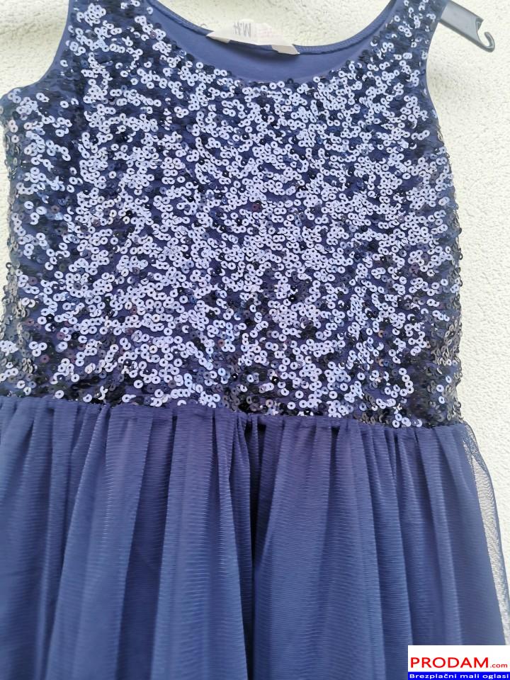 Obleka hm 146/152, 10-12 let. Svečana, prelepa, spodnji del s tilom, zgornji z bleščicami. Temno modre barve. Ne vidim napak.