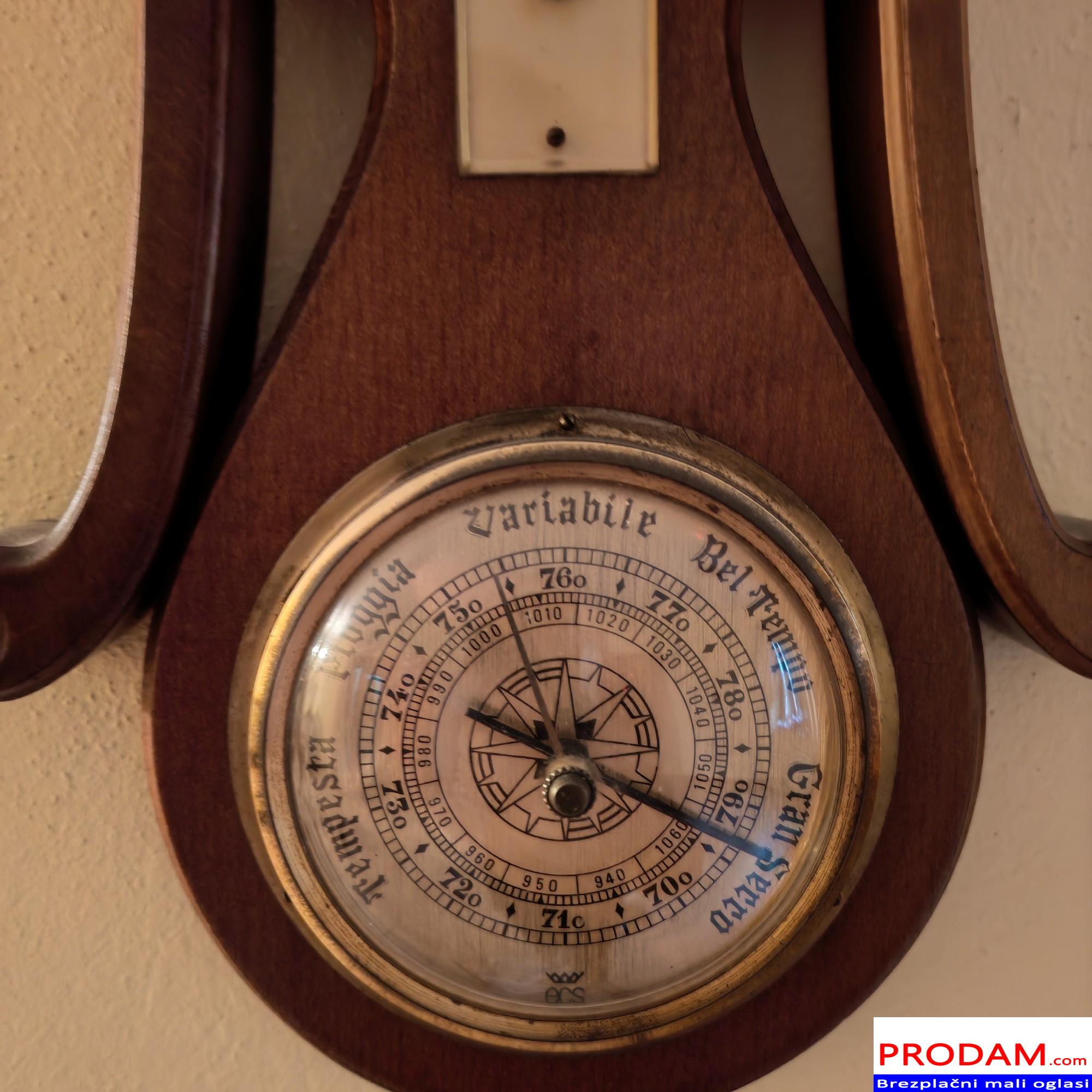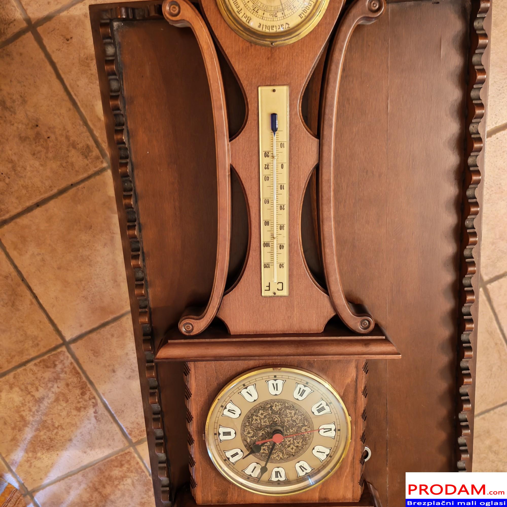 Dekorativno stensko vremensko postajo z uro, barometrom, termometrom in higrometrom. Lepo ohranjeno masivno leseno ohišje z rezbarjenimi detajli. Klasičen retro dizajn (70.–80. leta). Vsi instrumenti vidni in estetsko brez poškodb.