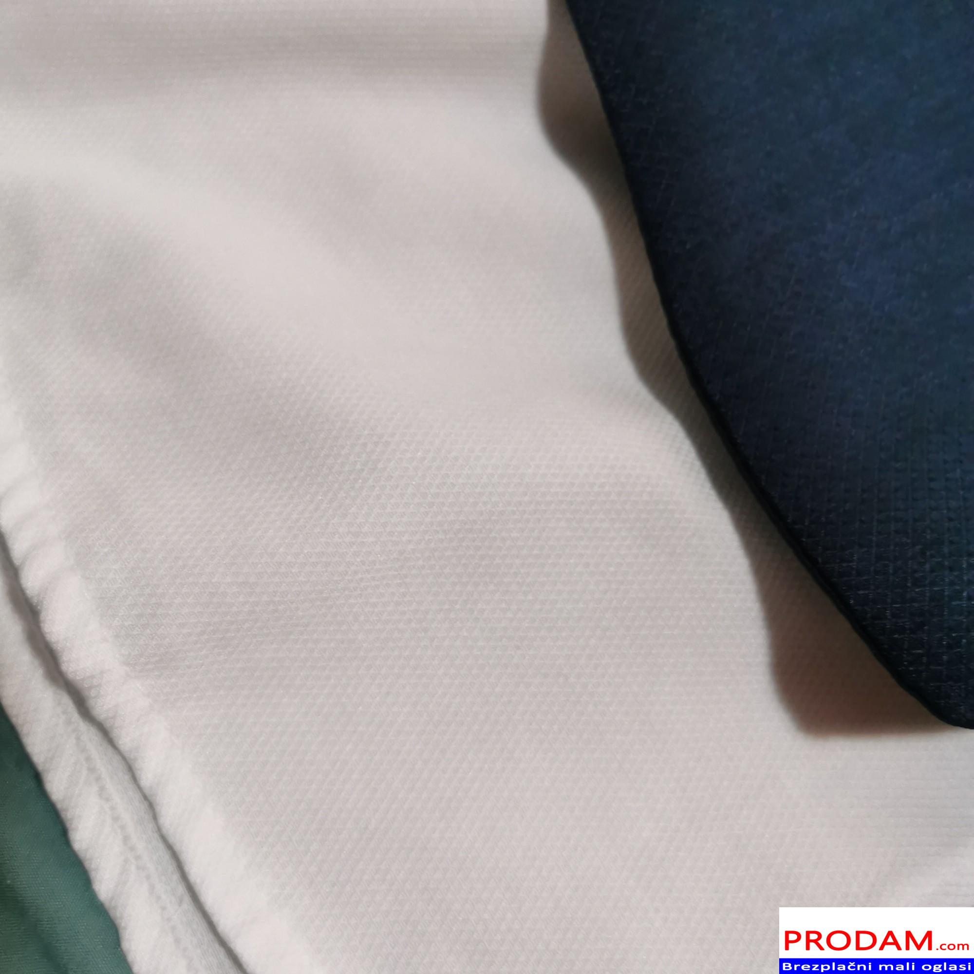 Komplet izredno lepo ohranjen. Material lahek, se ne mučka. Hlače so zlikane na črto, ni pa potrebno, če vam to ni všeč. V pasu imajo regulacijo, za suhe fante primerno. Srajca je z dolgimi rokavi, ki se lahko zaviha na kratek rokav, ter pritrdi z gumbi.