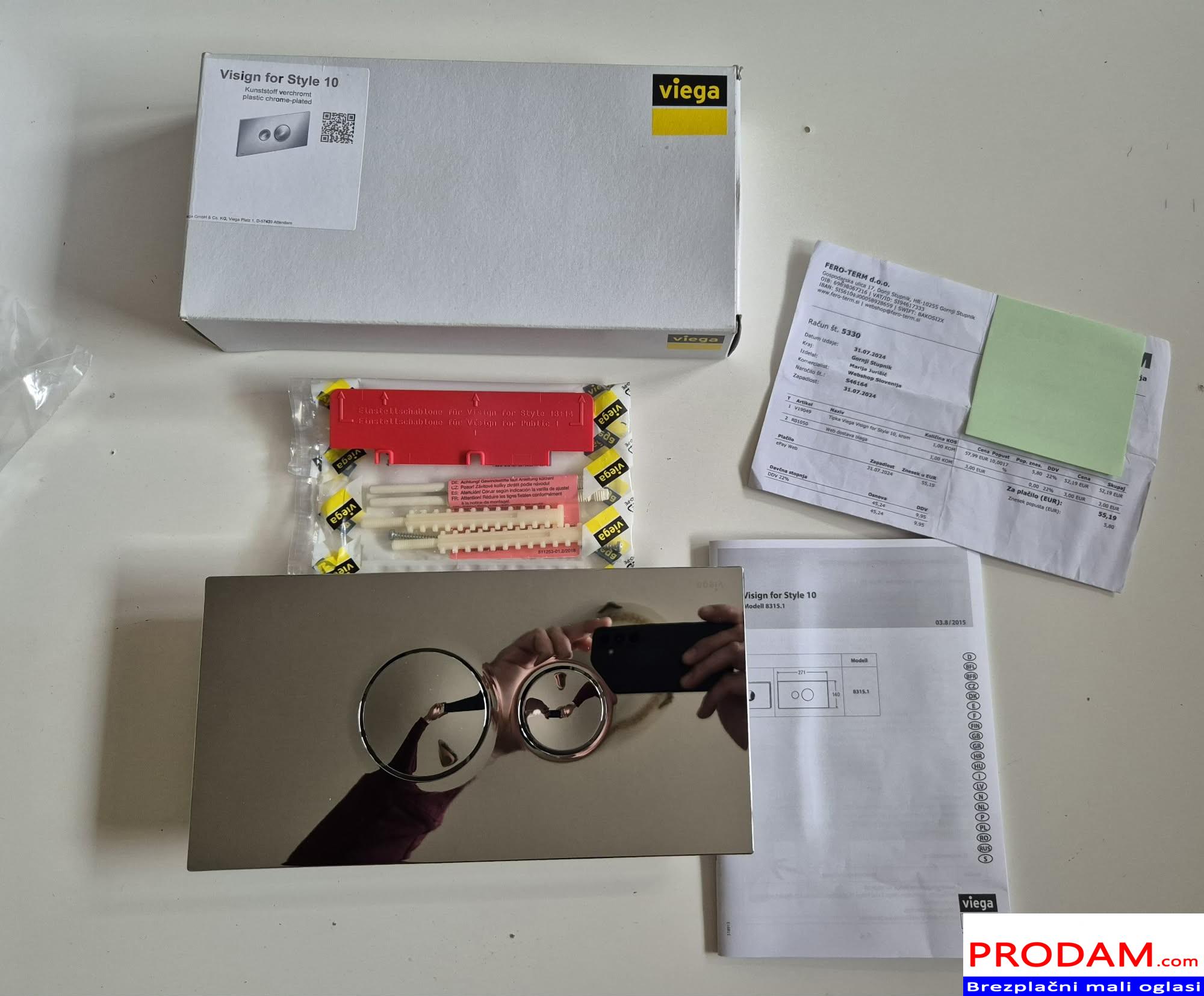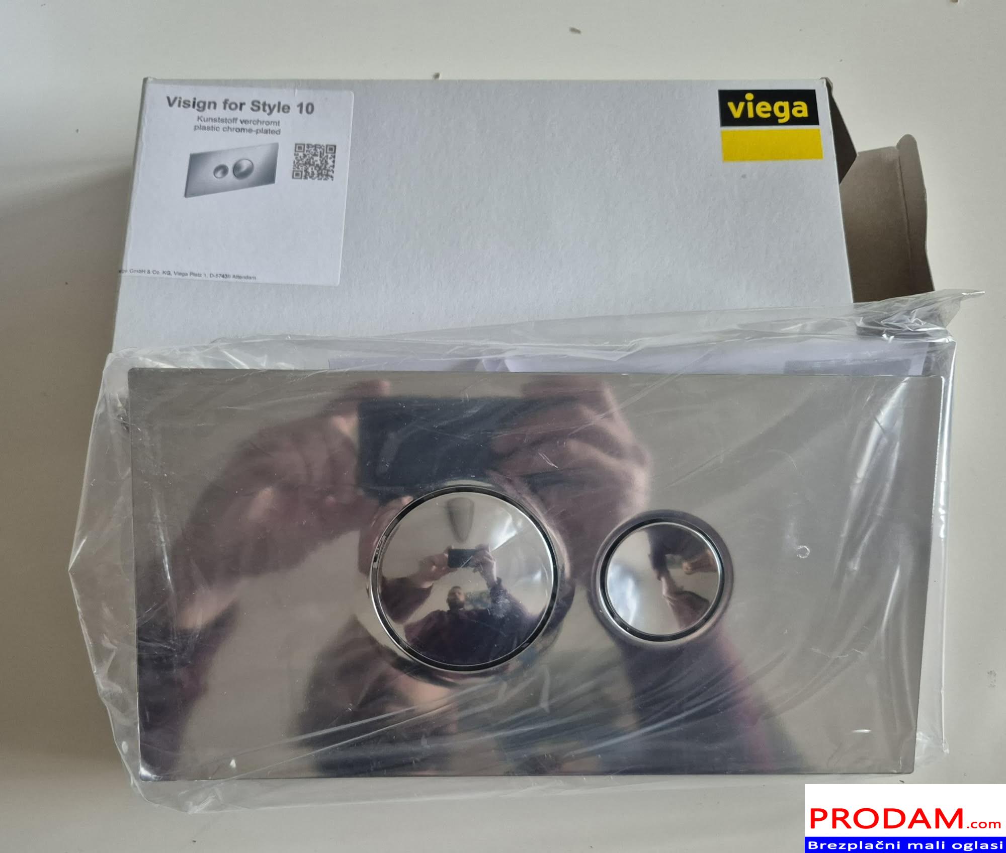 Prodam novo,zapakirano z računom tipko za splakovalnik Viega Visign for Style 10. Mere 271mm x 140mm. Barva krom sijaj. Nova plačana 55€,kupljena napačna dimenzija.